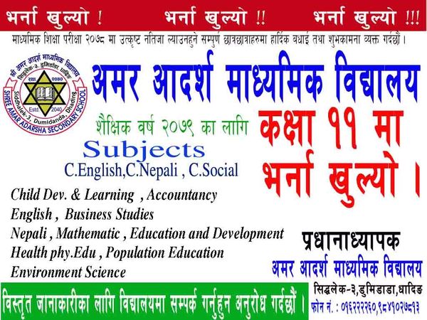 अमर आदर्श माध्यमिक विद्यालय कक्षा ११ मा भर्ना खुल्यो