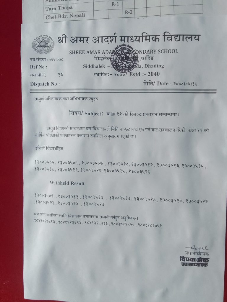 अमर आदर्श माध्यमिक विद्यालय कक्षा १२ को रिजल्ट प्रकाशन सम्बन्धमा सुचना