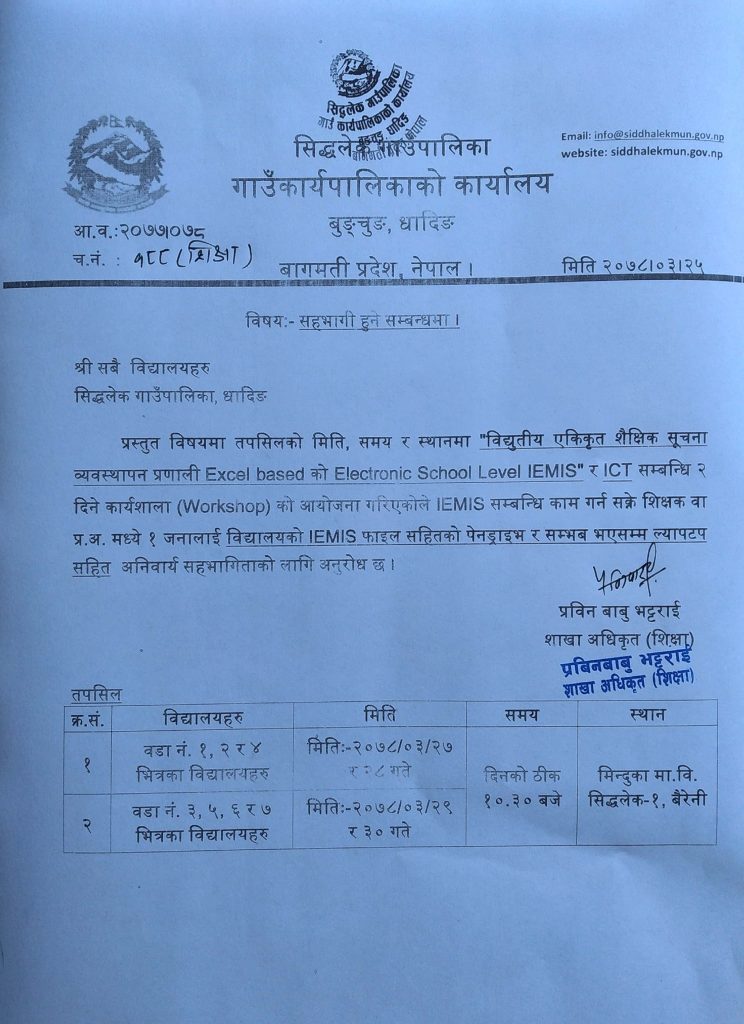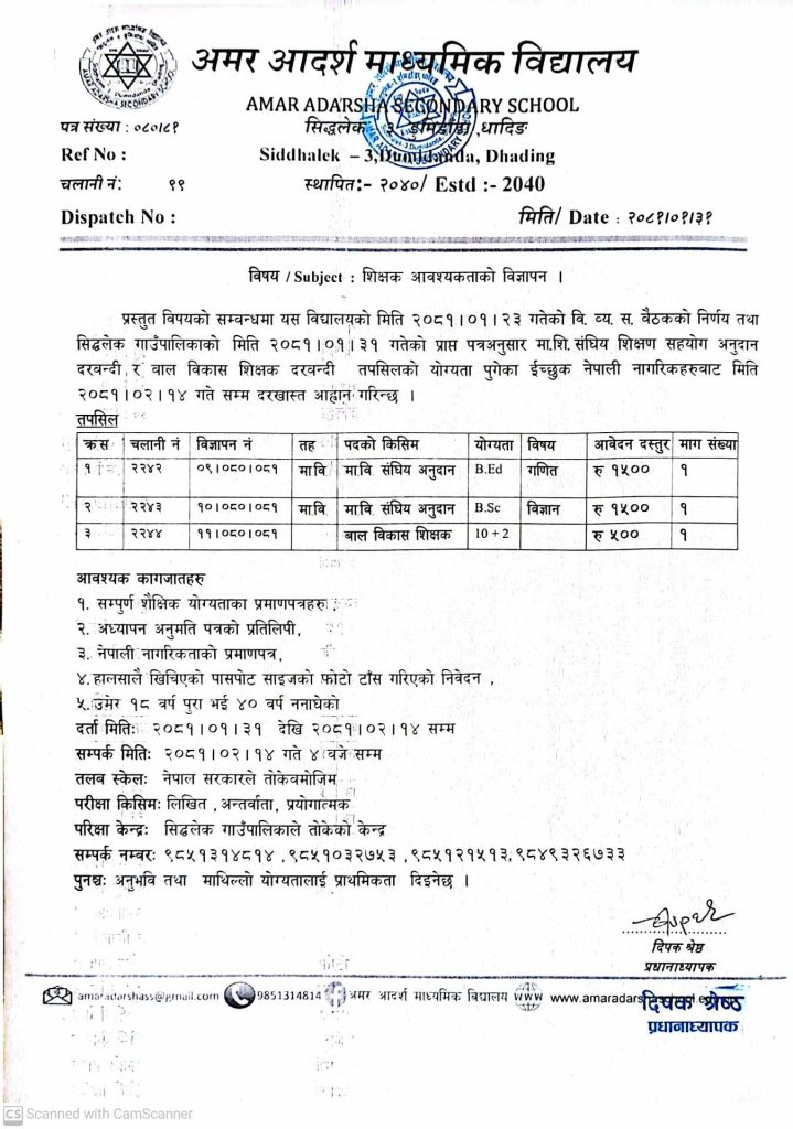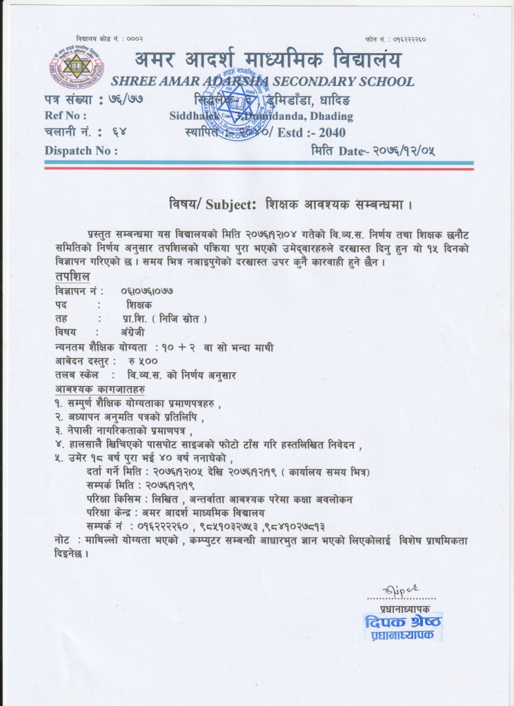 विषय / Subject : शिक्षक आवश्यकताको विज्ञापन । प्रस्तुत विषयको सम्बन्धमा यस विद्यालयको मिति २०८१।०१।२३ गतेको वि. व्य. स. बैठकको निर्णय तथा सिद्धलेक गाउँपालिकाको मिति २०८१।०१।३१ गतेको प्राप्त पत्रअनुसार मा.शि. संघिय शिक्षण सहयोग अनुदान दरबन्दी र बाल विकास शिक्षक दरबन्दी तपसिलको योग्यता पुगेका ईच्छुक नेपाली नागरिकहरुबाट मिति २०८१।०२।१४ गते सम्म दरखास्त आह्वान गरिन्छ […]